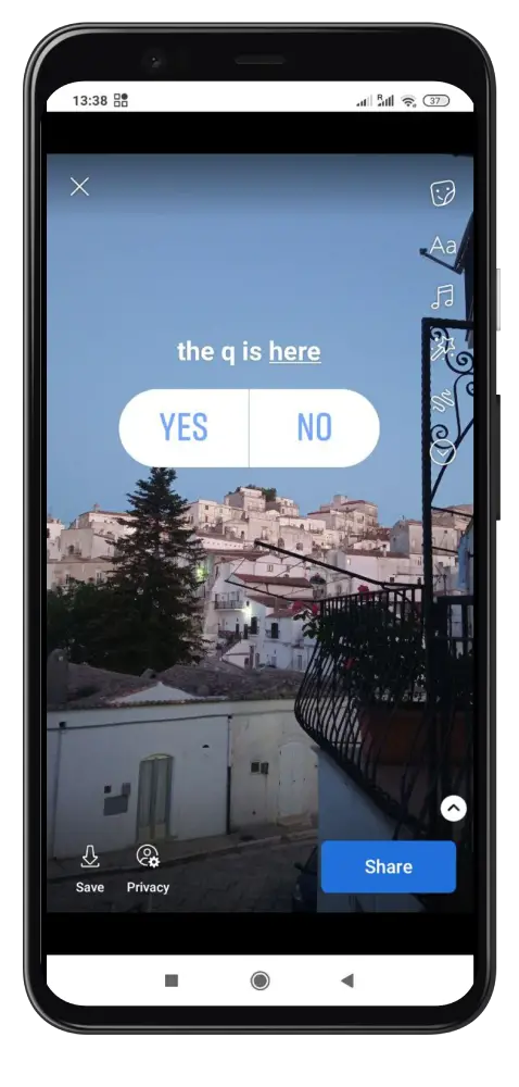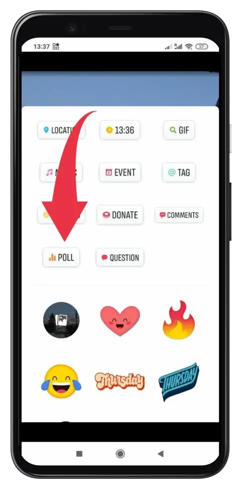 To add a poll, go to your Stories, and add your photo or video. Go to Settings and select the “Polls” widget. Just like with questions, you can choose the color and resize the polls. In a poll, you write your question text itself and two answer choices. It’s best if they are short – the answer boxes are quite small. That’s it, you can publish the survey!